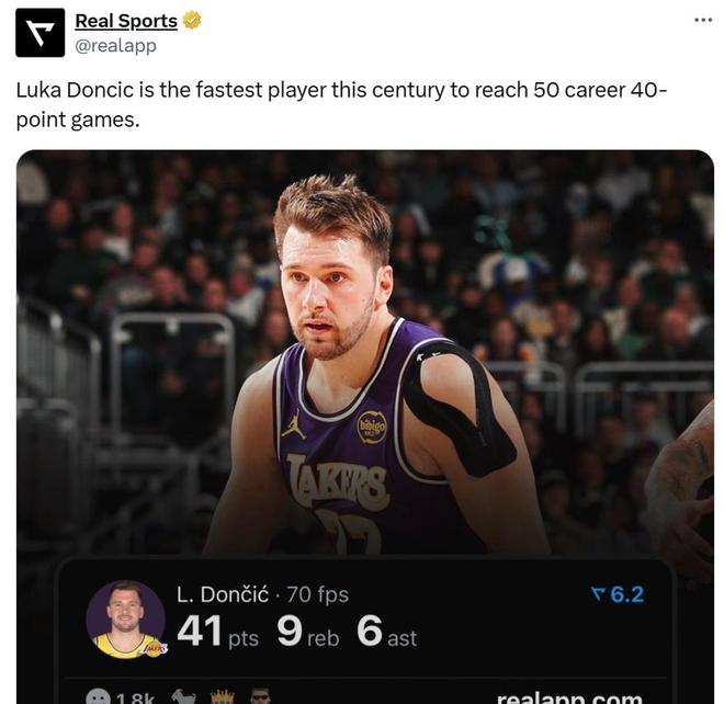 同时东契奇生涯已经第50次单场得40+,仅花费了460场比赛,为21世纪球员中最快。