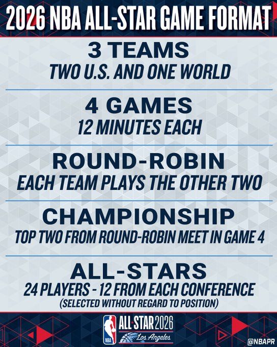 2026年NBA全明星赛中,两支美国本土球员队伍与一支国际球员队伍(即世界队)将采用循环赛制展开对决,赛事共包含4场比赛,每场比赛时长为12分钟。三支队伍每队至少配备8名球员。